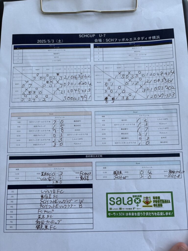 U8 SCHカップU7 投稿日: 2025年6月17日 投稿者: official_NSC 5月3日(土)U8クラスがカップ戦に参加しました。どの試合も接戦で貴重な経験となりました。 ++++++++++++++++++++++日程:5月3日(土)会場:SCHフッボルエスタディオ横浜対戦相手:しらとり台FC、SCH-W、鶴見東FC形式:5人制、総当たり(6-3-6)、順位戦 ++++++++++++++++++++++